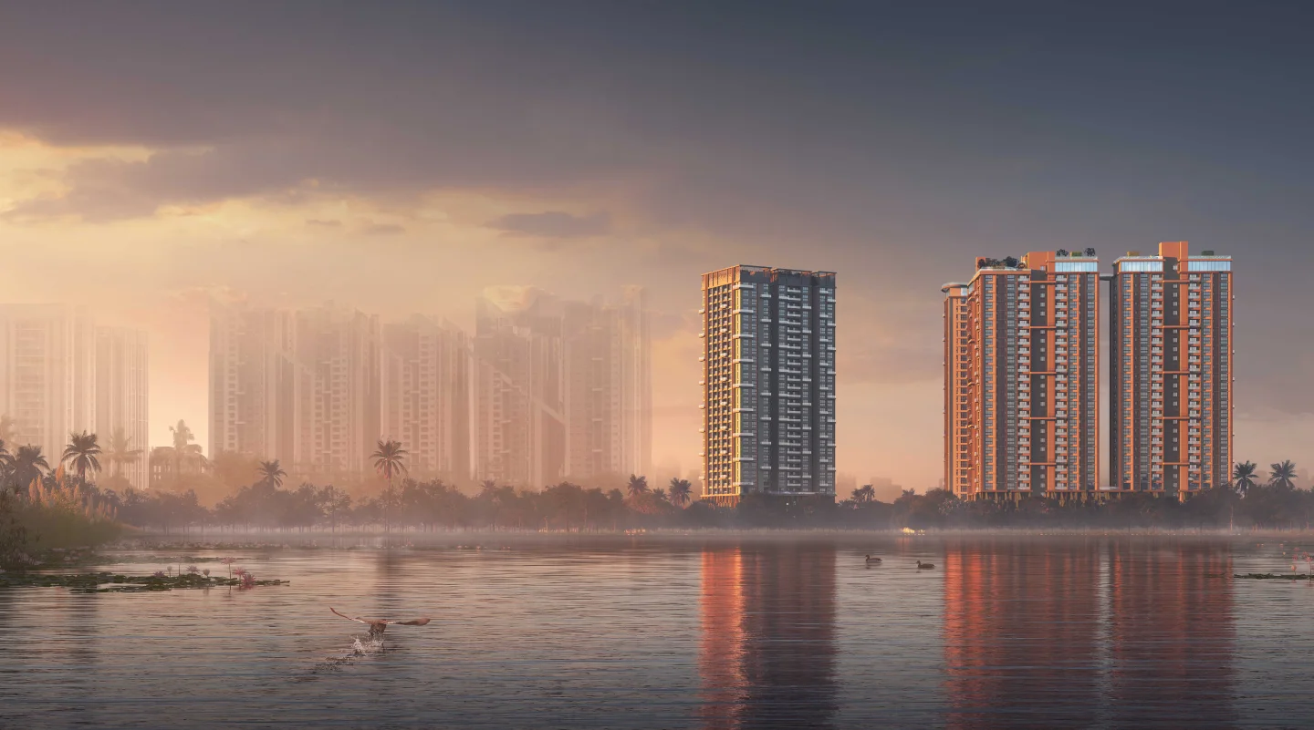 Crown at Aquaview faces 12,500-hectare wetlands. Enjoy serene water views and a double-height Skywalk enhancing grandeur, adjacent to Sector V in Kolkata East.